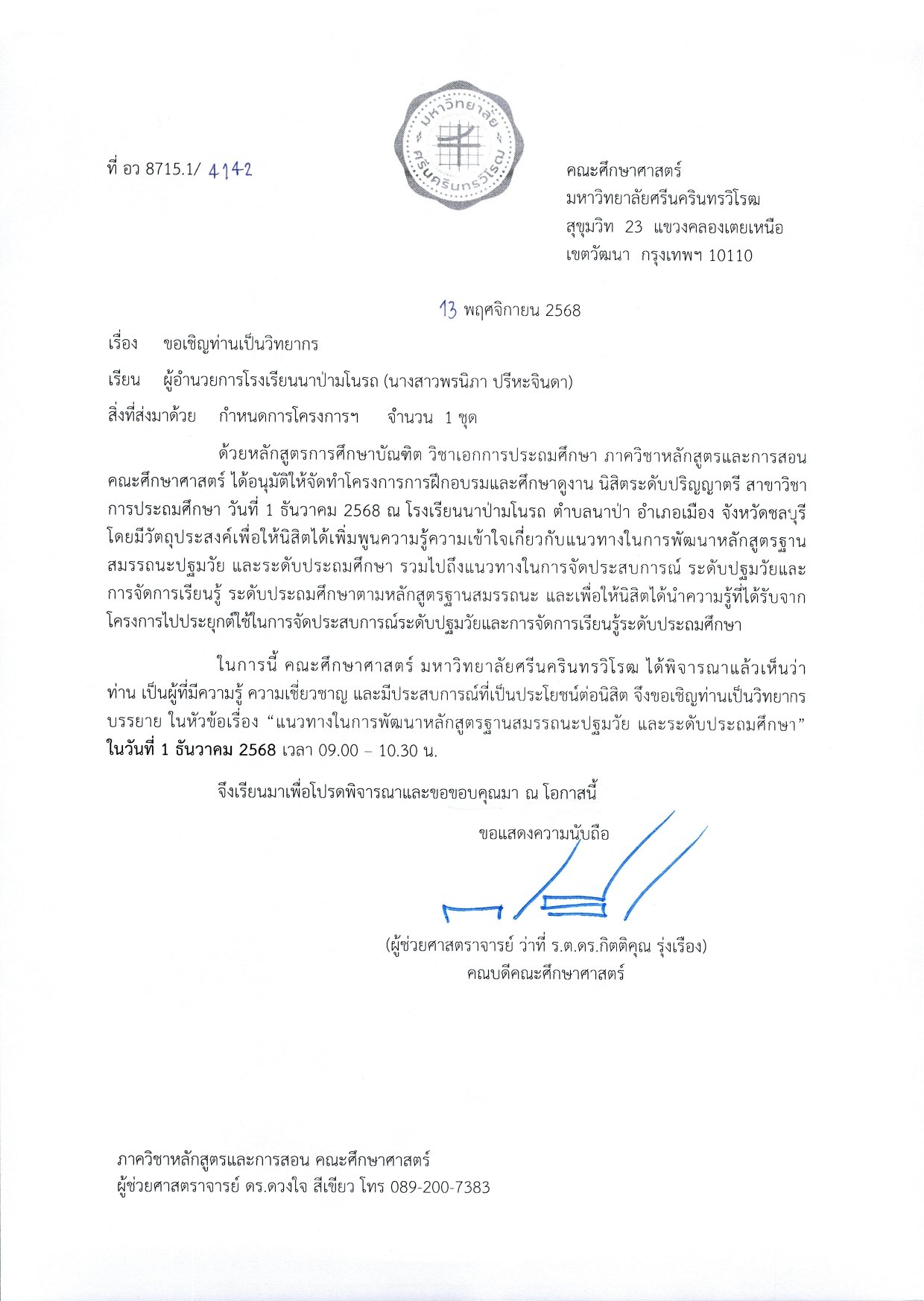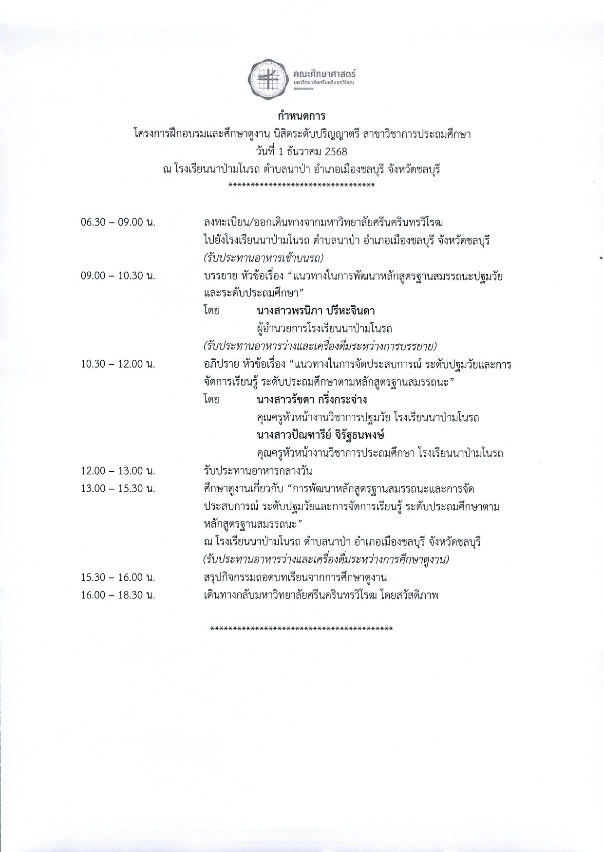 วันที่ 1 ธันวาคม 2568...โรงเรียนนาป่ามโนรถ ให้การต้อนรับ...ผู้ช่วยศาสตราจารย์ ดร.ดวงใจ สีเขียว ภาควิชาหลักสูตรและการสอน คณะศึกษาศาสตร์ มหาวิทยาลัยศรีนครินทรวิโรฒ และนิสิตหลักสูตรปริญญาตรี ชั้นปีที่ 4 (โครงการเพชรในตม) มหาวิทยาลัยศรีนครินทรวิโรฒ ในการศึกษาดูงาน “การพัฒนาหลักสูตรฐานสมรรถนะ และการจัดประสบการณ์การเรียนรู้ระดับปฐมวัยและการจัดการเรียนรู้ระดับประถมศึกษา ตามหลักสูตรฐานสมรรถนะ” ของโรงเรียนนาป่ามโนรถ โดยมีกิจกรรมการบรรยายให้ความรู้ และการเยี่ยมชมชั้นเรียน หวังเป็นอย่างยิ่งว่านิสิตจะได้นำความรู้และประสบการณ์ที่ได้รับจากการศึกษาดูงานในครั้งนี้ไปประยุกต์ใช้ในการพัฒนาตนเอง และพัฒนาวิชาชีพครูได้อย่างมีประสิทธิภาพต่อไป