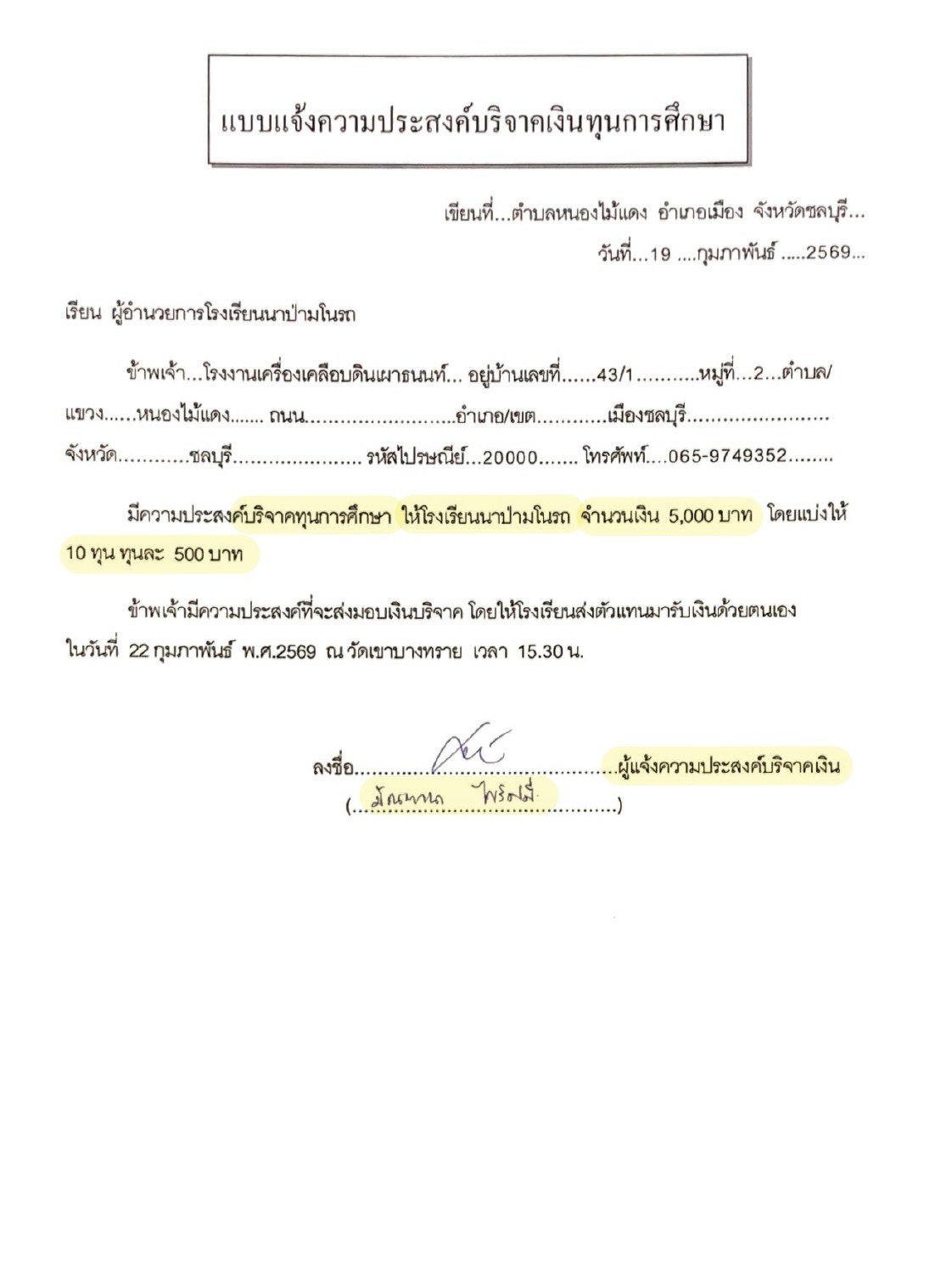 23 ก.พ.69...ขอบพระคุณ “คุณมัณฑนา ไขรัศมี” ผู้ใหญ่ใจดีที่มอบทุนการศึกษาให้กับเด็ก ๆ โรงเรียนนาป่ามโนรถ จำนวน 10 ทุน ๆ ละ 500 บาท รวมเป็นเงินทั้งสิ้น 5,000 บาท ขอให้ท่านและครอบครัวมีสุขภาพพลานามัยที่แข็งแรง สมบูรณ์ มีความสุข สมหวังในทุกสิ่งที่ปรารถนา ปราศจากโรคภัยและความทุกข์ทั้งปวง โรงเรียนนาป่ามโนรถ ขอขอบพระคุณมา ณ โอกาสนี้ค่ะ...